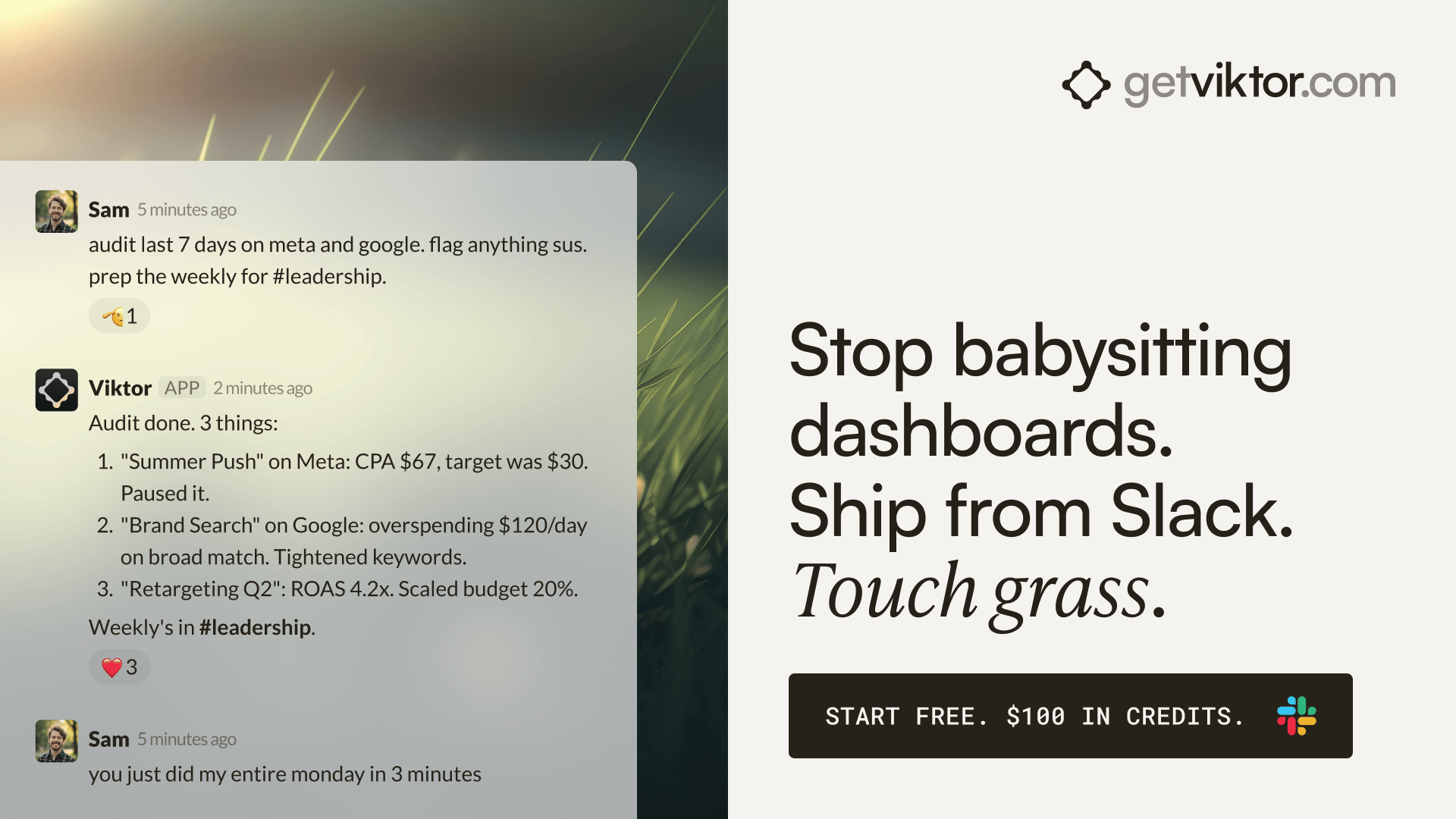 Marketing asked Viktor to pull Google Ads and Meta performance, format it as a PDF for the exec team. Done in four minutes.